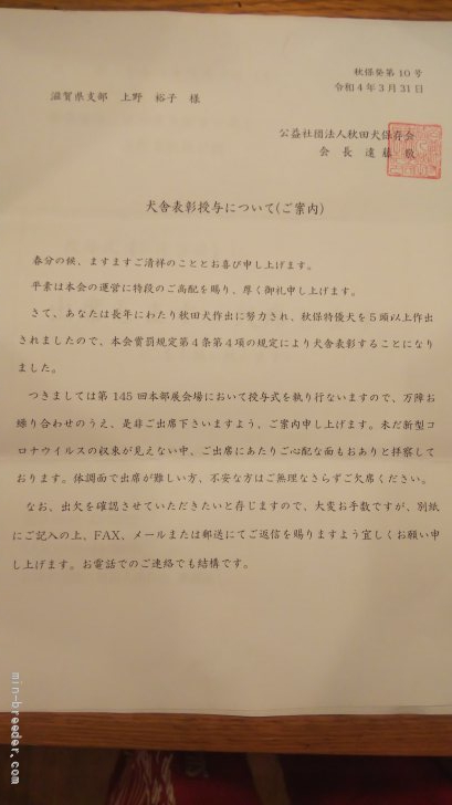 5月3日の秋田県大館市で開催される本部展で、私も表彰してもらえることになりました。