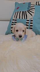 ミニチュアダックスとカニンヘンダックスの間にとっても可愛いベビーちゃんが5匹産まれました😊この子は白に近い綺麗なイエローの男の子です、毛量の有るしっかりした体型の子でお顔もとっても可愛いです(*^▽^*)